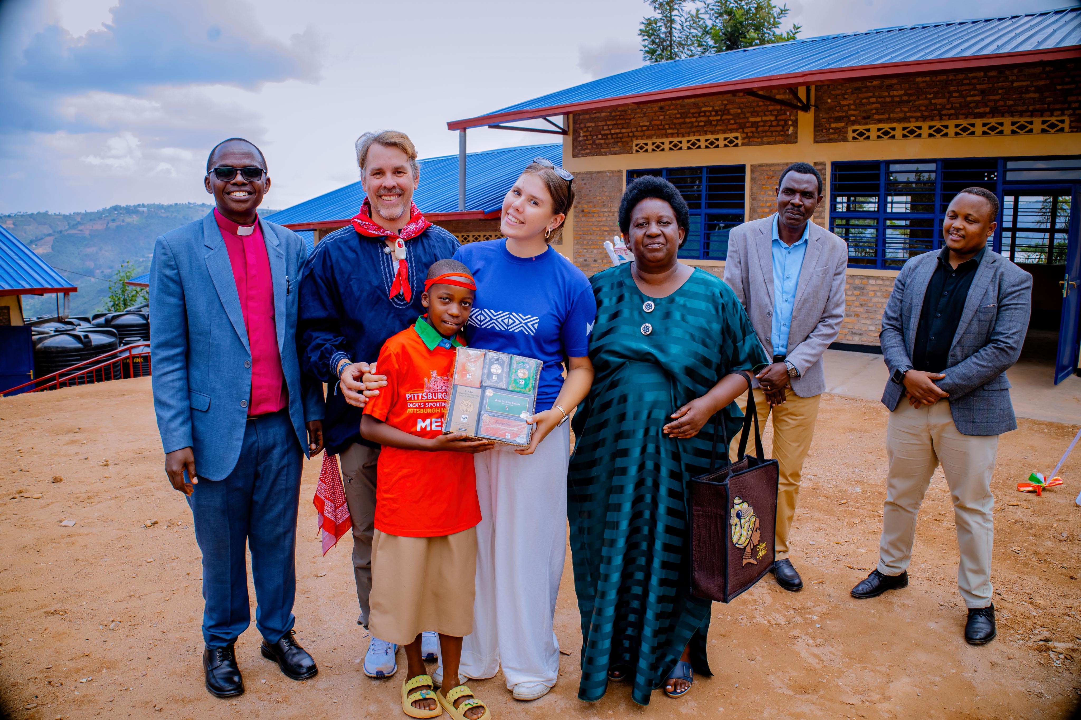 Für Charlotte Fitze und ihren Vater Daniel war es ein ganz besonderes Erlebnis die Schule in Kinihira auf ihrer privaten Reise zu besuchen, nachdem sie das Projekt über mehrere Jahre auch als Familie unterstützt hatten und ein während der Corona-Zeit geplanter Besuch seitens JSG und Kirchenkreis pandemiebedingt abgesagt werden musste. Schon lange hatte Charlotte davon geträumt ihr Herzensprojekt zu besuchen und fühlte sich nun besonders geehrt, die neuen Räume mit eröffnen zu dürfen, gewissermaßen als inoffizielle Repräsentanten der Ruanda-AG am JSG. Bei dem Besuch übergaben die beiden Gäste auch acht Fußbälle als Geschenk des Heimat- und Verkehrsvereins Neukirchen, in welchem Daniel Fitze Mitglied ist und zwei Laptops vom JSG. Empfangen wurden sie mit traditionellen Tänzen der Schülerinnen und Schüler, die sie zum Mittanzen gleich an die Hand nahmen.