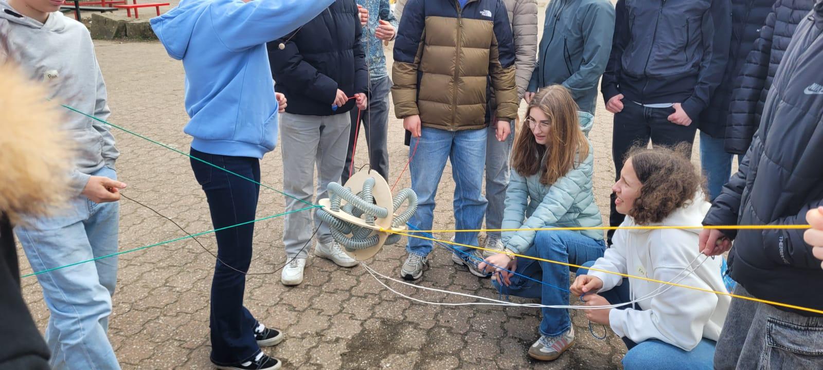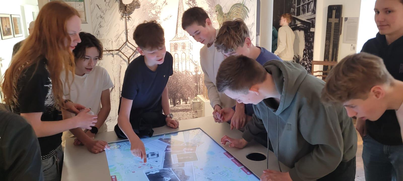 Zunächst lernten sich einzelne Schülerinnen und Schüler in niederländisch-deutschen Kleingruppen in „Speed-Dating“-Interviews kennen und stellten ihre Interviewpartner anschließend einer größeren gemischten Gruppe vor. Bei länderübergreifenden Kooperationsspielen auf dem Schulhof mussten sodann gemeinsam knifflige Aufgaben gelöst werden. Anschließend gab es ein gemeinsames Mittagessen im unserer Mensa, gefolgt von einer Schulführung auf Englisch durch die deutschen Schüler. Den Nachmittag genossen alle zusammen im Vluyner Dorfkern. Die Gäste vom Dorenweerd-College freuten sich über die - wenn auch sehr begrenzten - Einkaufsmöglichkeiten in Vluyn, bevor sich alle zum Eisessen im Eiscafé auf dem Vluyner Platz trafen. Abschließend besuchten die niederländischen Gäste noch das stadthistorische Museum und entdeckten auf spielerische Weise die Geschichte Neukirchen-Vluyns. Bei der deutschsprachigen Führung konnten sie auch ihre Fremdsprachenkenntnisse nach drei Jahren Deutschunterricht unter Beweis stellten.