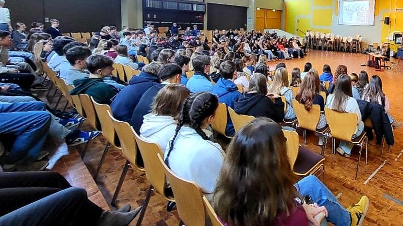 Schon seit über zehn Jahren besucht Eva Ritz-Weyl unsere Schule, um von ihrer Zeit im Konzentrationslager Westerborg zu berichten. Am 10. November 2025 wurde es deshalb wieder sehr still in der Aula. Die gesamte Jahrgangsstufe 10, der Leistungskurs Geschichte aus der Q1 und drei Oberstufenkurse der Gesamtschule Niederberg hörten der 90-jährigen Dame gebannt zu. Diese erzählte die Geschichte ihrer Familie vor, während und nach dem Holocaust: