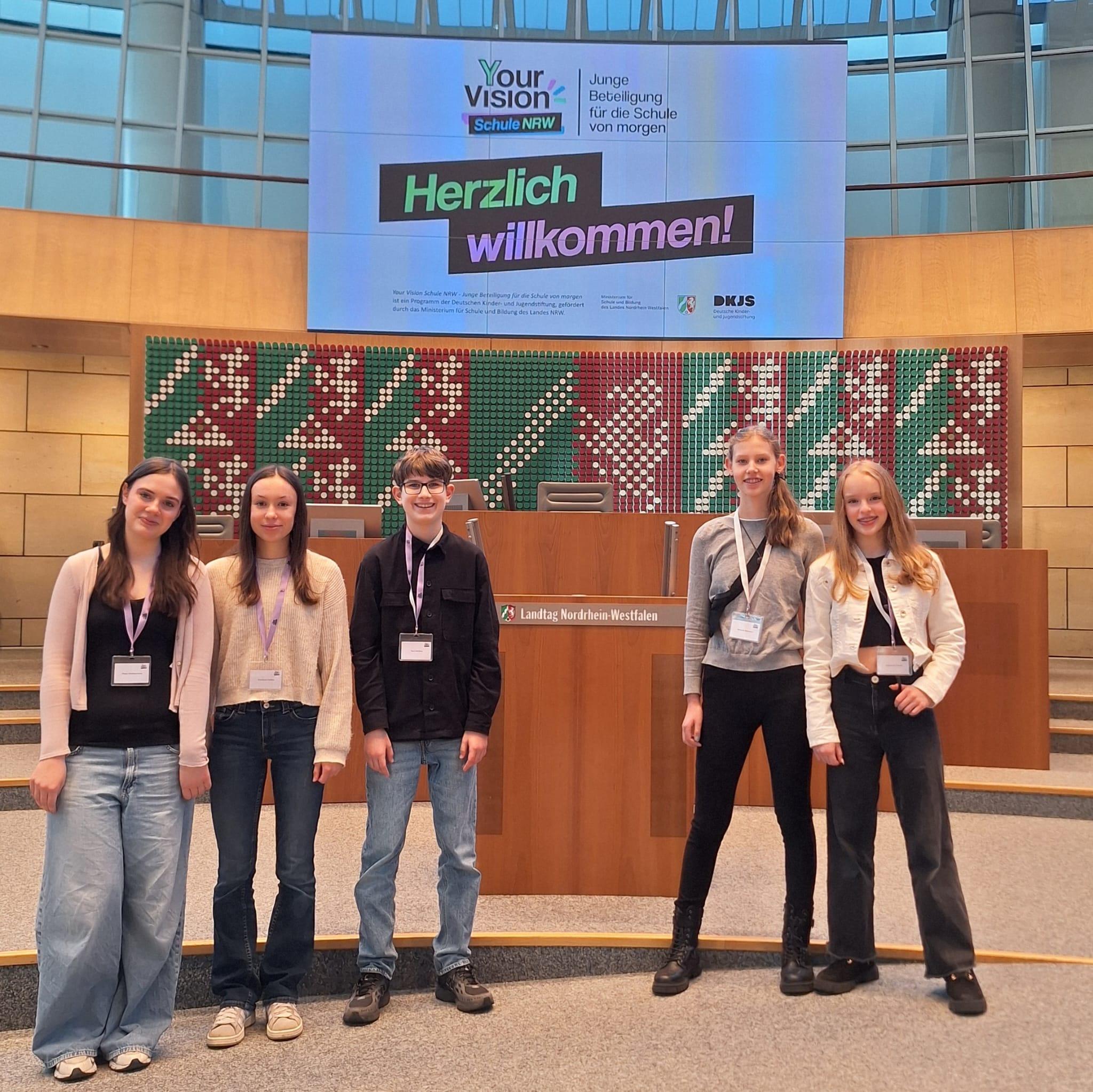 Den Abschluss bildete nun ein Besuch im Landtag NRW zu dem die Projektgruppe eingeladen war. Gemeinsam mit rund 150 Schülerinnen und Schüler aus ganz NRW trafen unsere Schülerinnen und Schüler Schulministerin Dorothee Feller, um mit ihr in den Austausch zu treten. In verschiedenen Workshops wurden Ideen weiterentwickelt und diskutiert. Die Hoffnung ist, dass diese Impulse nun auch den Weg in politische Entscheidungsprozesse finden.